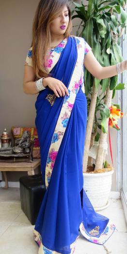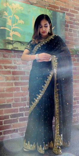 Sarees are the traditional attire for Indian women. This kind of attire is also a three piece set. It is a long piece of embroidered or embellished finished fabric that is wrapped around and tucked into a Petticoat (Skirt). The Blouse is stitched in different styles and lengths.